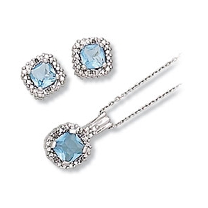 Genuine Diamond with Square Light Blue Colored CZ Center Pendant and Earring Set