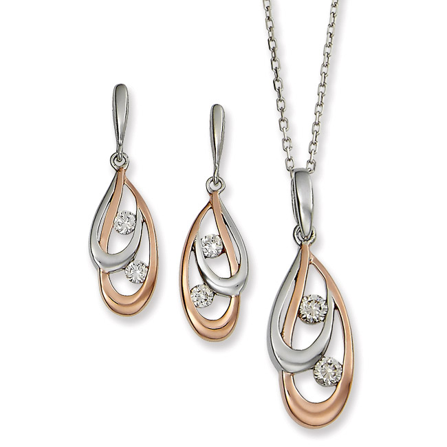 .925 Silver Rose Gold TT Intertwined Double Teardrop with Clear CZ Design Pendant and Earring Set
