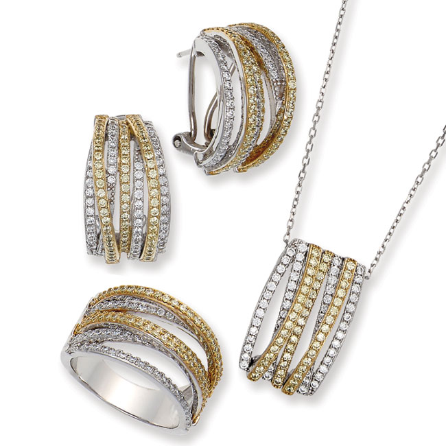 .925 Silver Two Tone Seven Line Design with Yellow and Clear CZ's Pendant, Earring and Ring Set