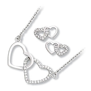 Plain and Clear CZ Double Heart Necklace and Earring Set