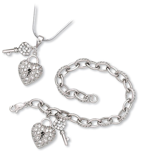 Puffed Heart Lock and Key with Clear CZ Pendant,Earring and Bracelet Set