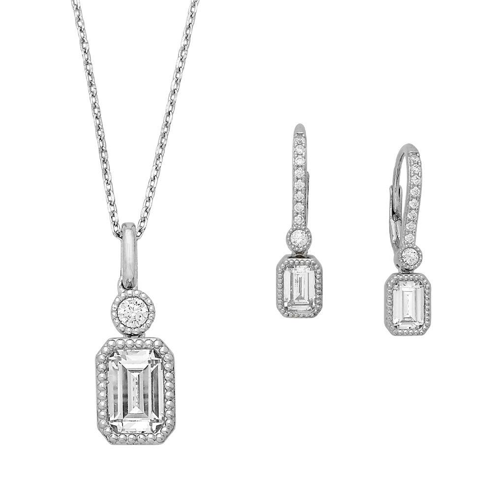 .925 sterling silver halo detail around emerald-cut cz dangle and round cz necklace 16"+2" ext and leverback earrings set