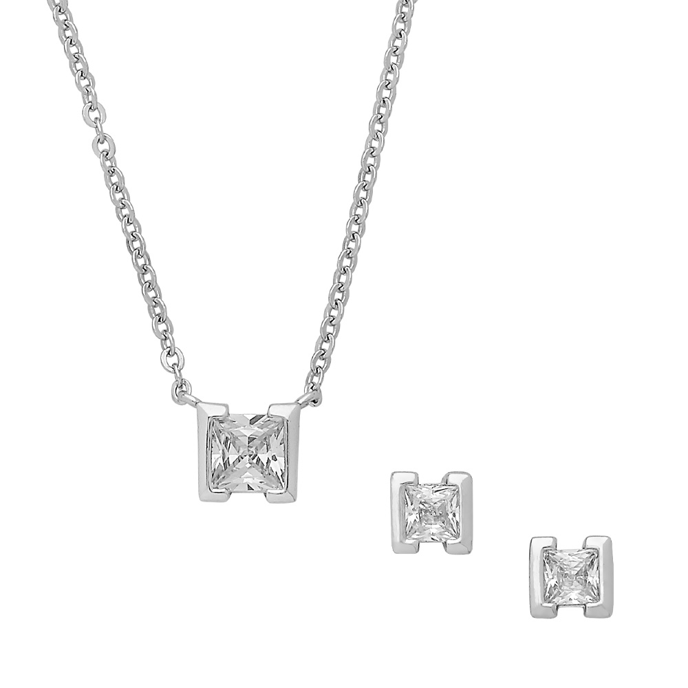 Sterling Silver Square 4.5mm Solitaire CZ Necklace 16"+2" ext and Stud Earrings Set