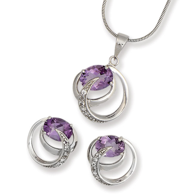 .925 Silver Double Swirl Design with Genuine Amethyst and White Topaz Pendant and Earring Set