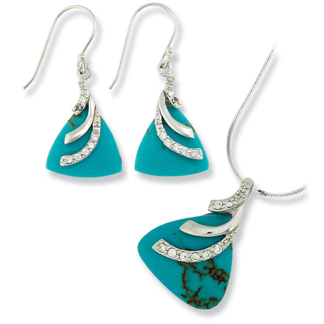 .925 Silver Curved Lines with Clear CZ Earring & Pendant Set w/Imitation Triangle Turquoise