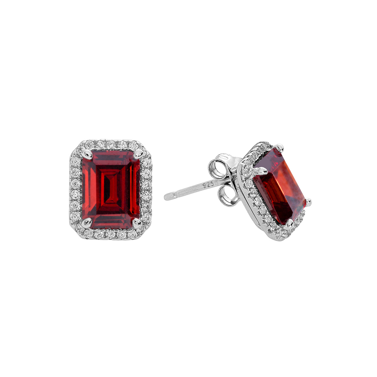 Silver Clear CZs Halo Design Earrings with Large Garnet CZ (January)