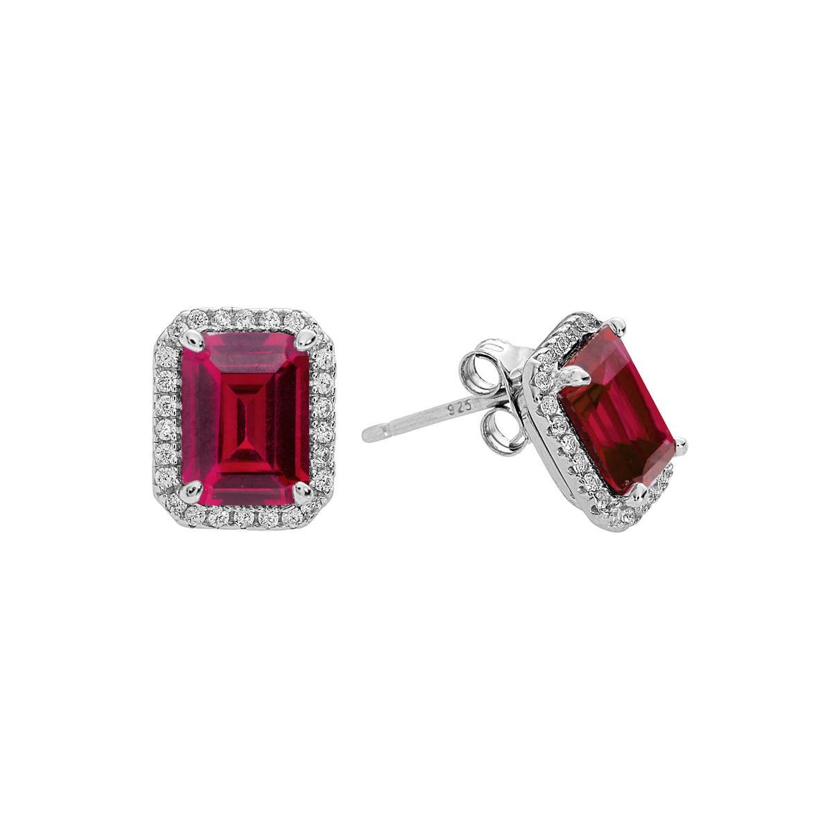 .925 Silver Clear CZ's Halo Design with Large Ruby Spinel Center Earrings July