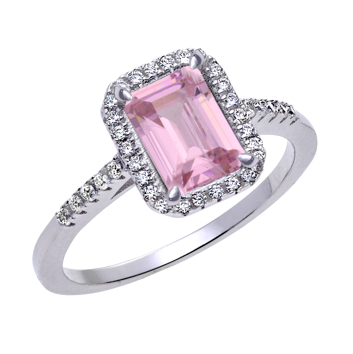 Silver Clear CZs Halo Design Ring with Large Pink CZ (October)