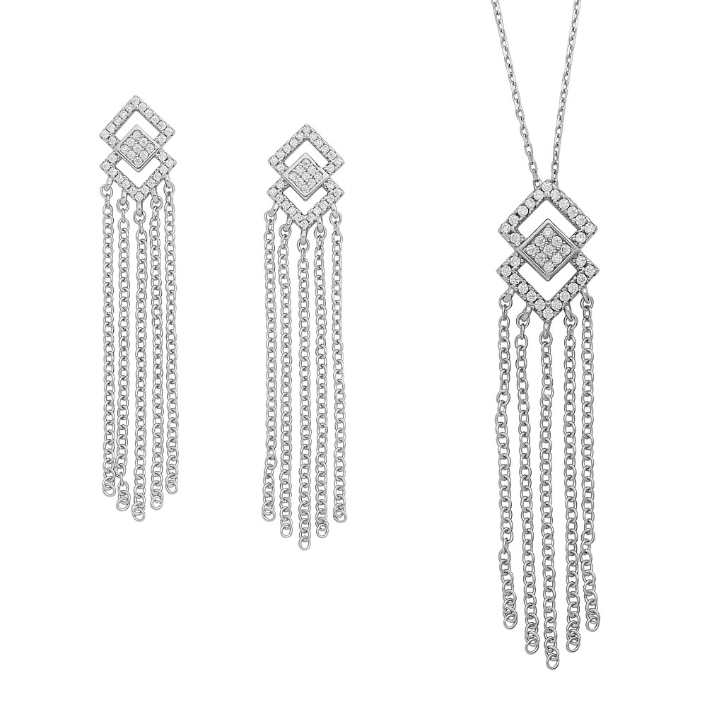 Silver Clear CZs on a Triple Rhombus Pendant and Earrings Set with 5 Chain Dangles