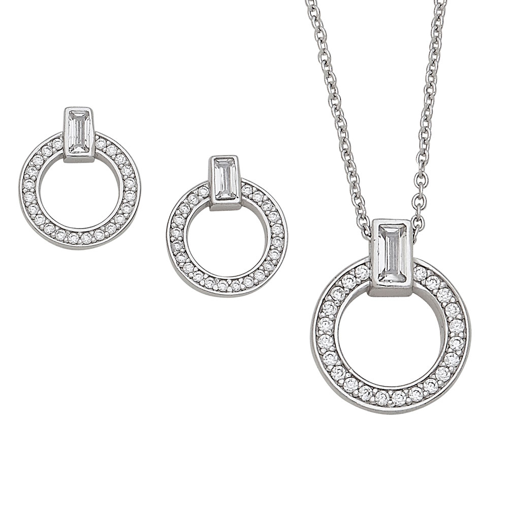 Silver Door Knocker Necklace Baguette and Earring Set with Round CZs