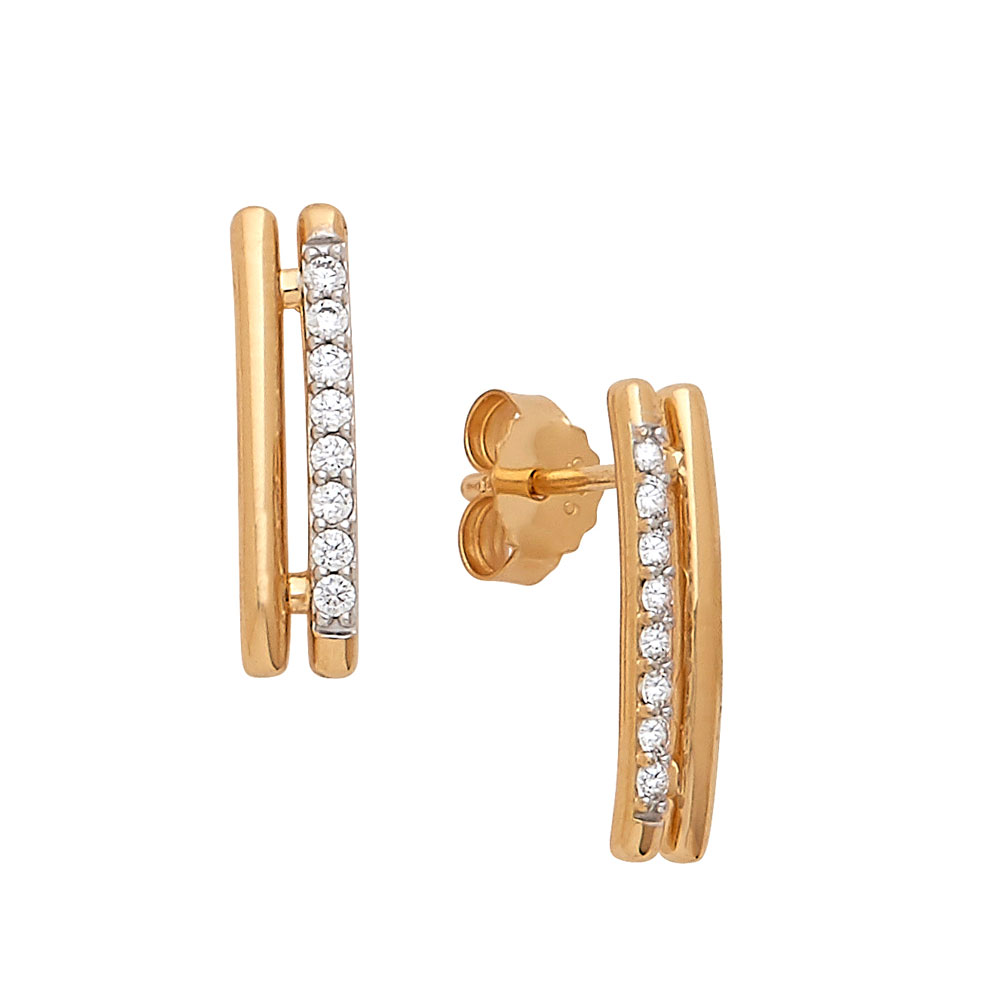 .925 silver gold-plated double bar post earrings one side straight row of 8 small round clear cz's and other side plain high polish finish