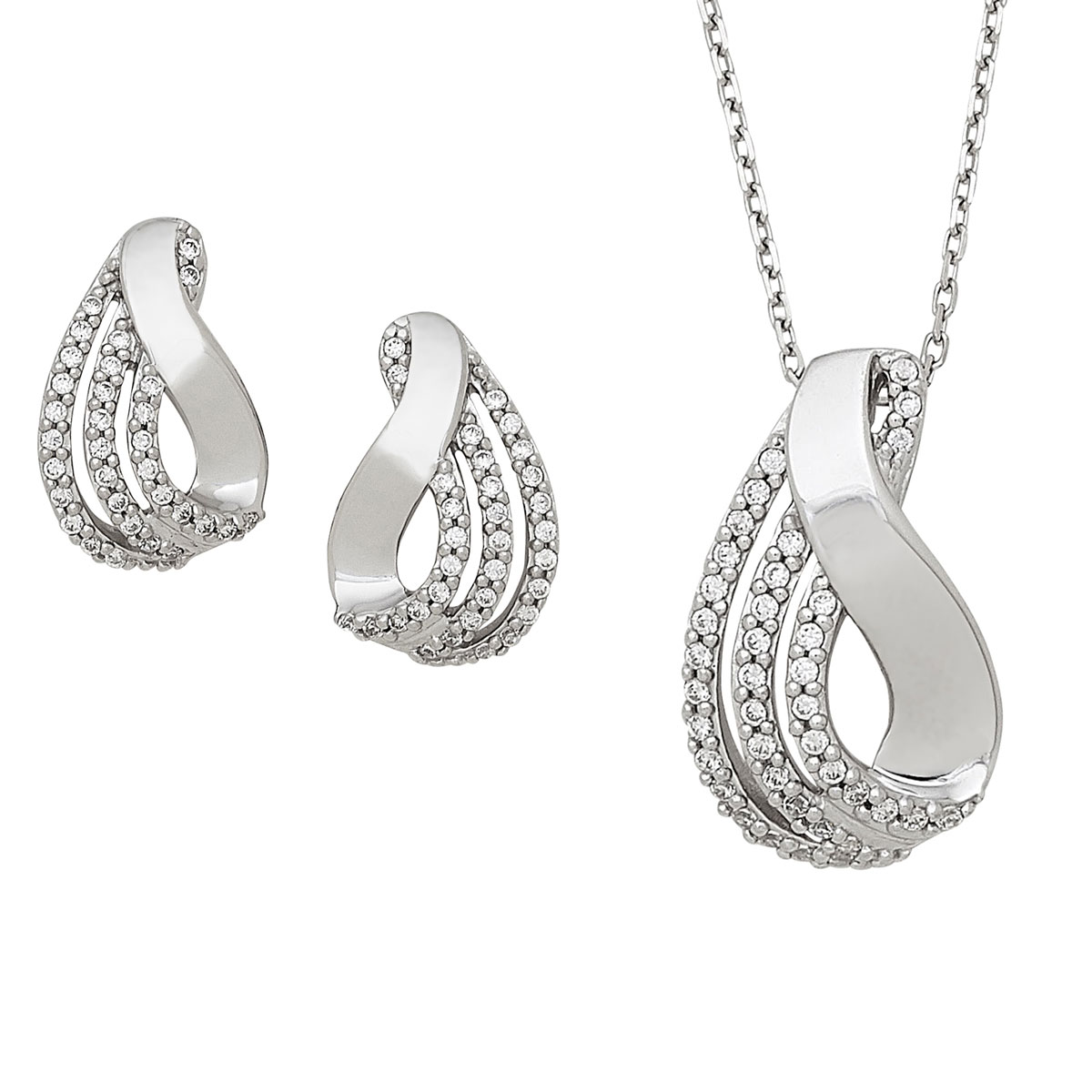 .925 Silver High-polish Swirl on one side with three rows of CZs on the other, Pendant and Post Earring Set
