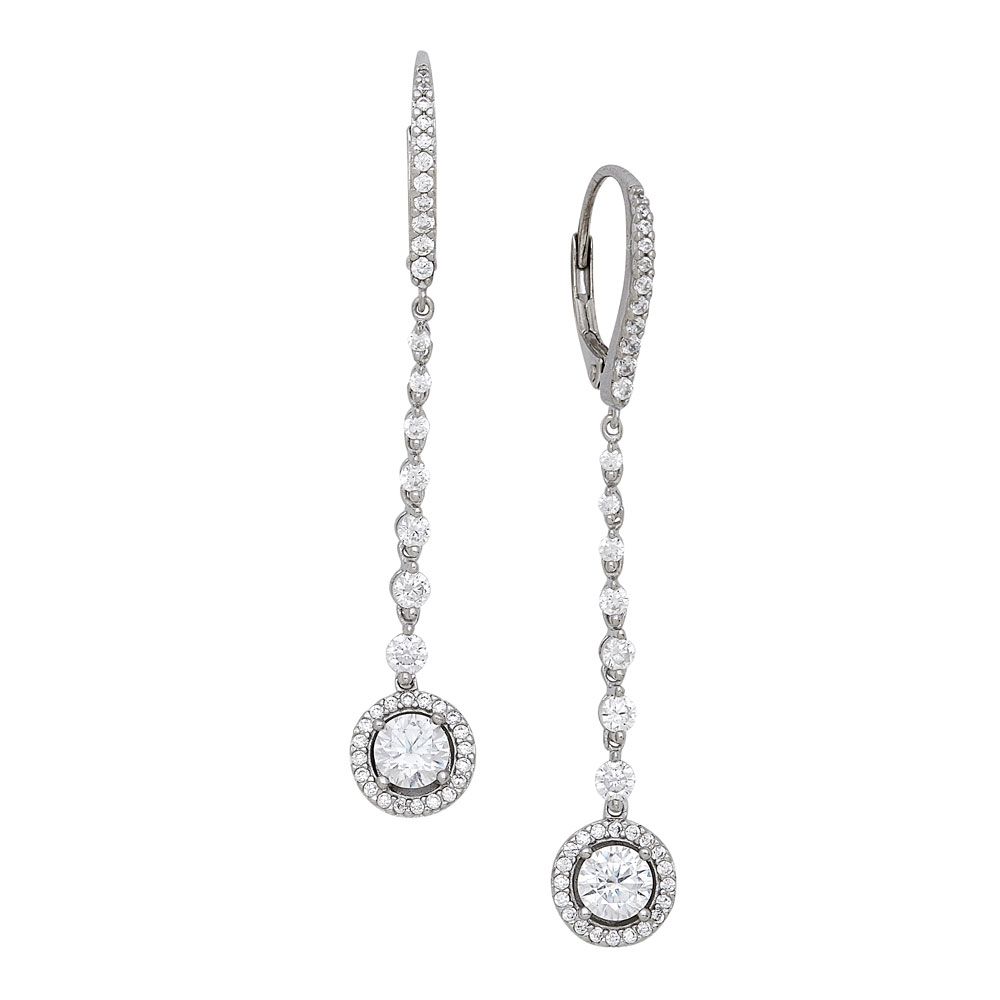 .925 Silver Long Drop Leverback Earrings Round CZs