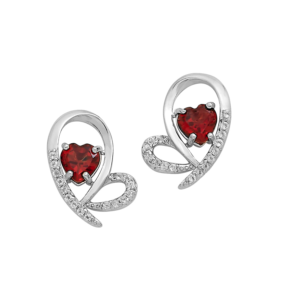 .925 Silver Open Heart Design Earrings with Heart Shape Genuine Garnet and White Topaz side stones