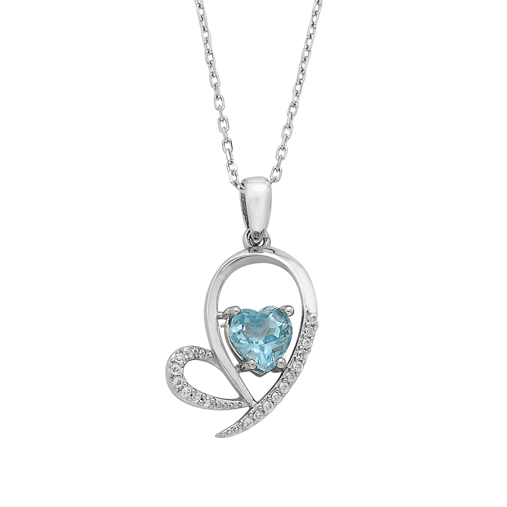 .925 Silver Open Heart Design Pendant with Heart Shape Genuine Blue Topaz and White Topaz side stones