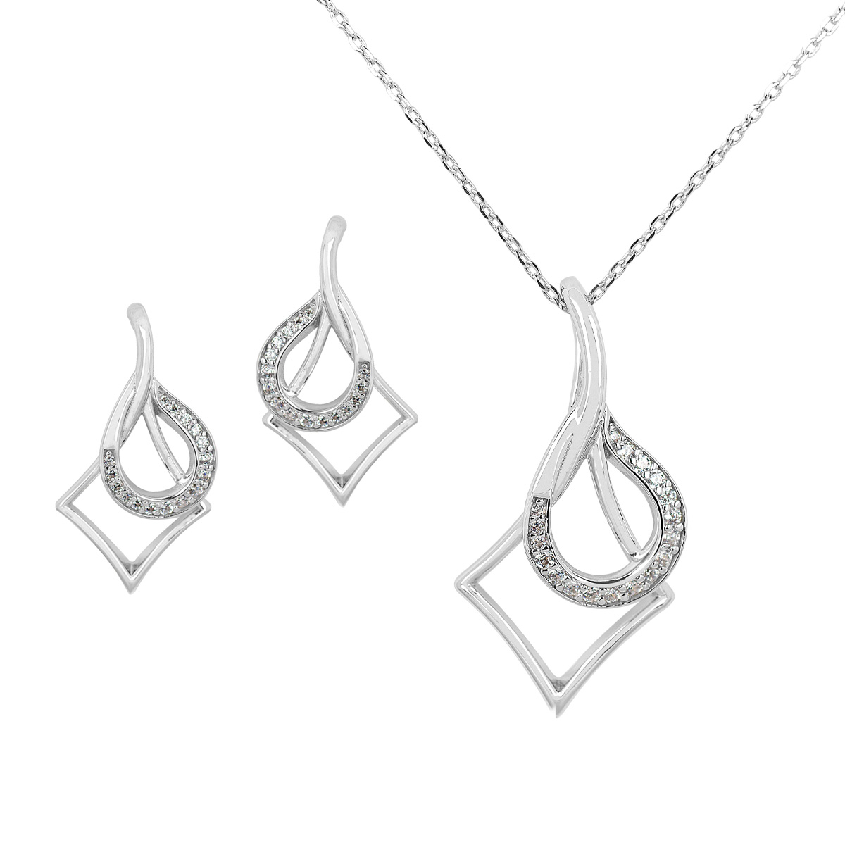 Silver Open Loop with CZs over a Plain Lozenge Shape Necklace and Earrings Set