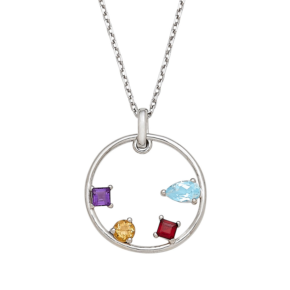 .925 Silver Open Round Pendant with all Genuine Stones Square Amethyst, Round Citrine, Princess cut Garnet, Sky Blue Topaz
