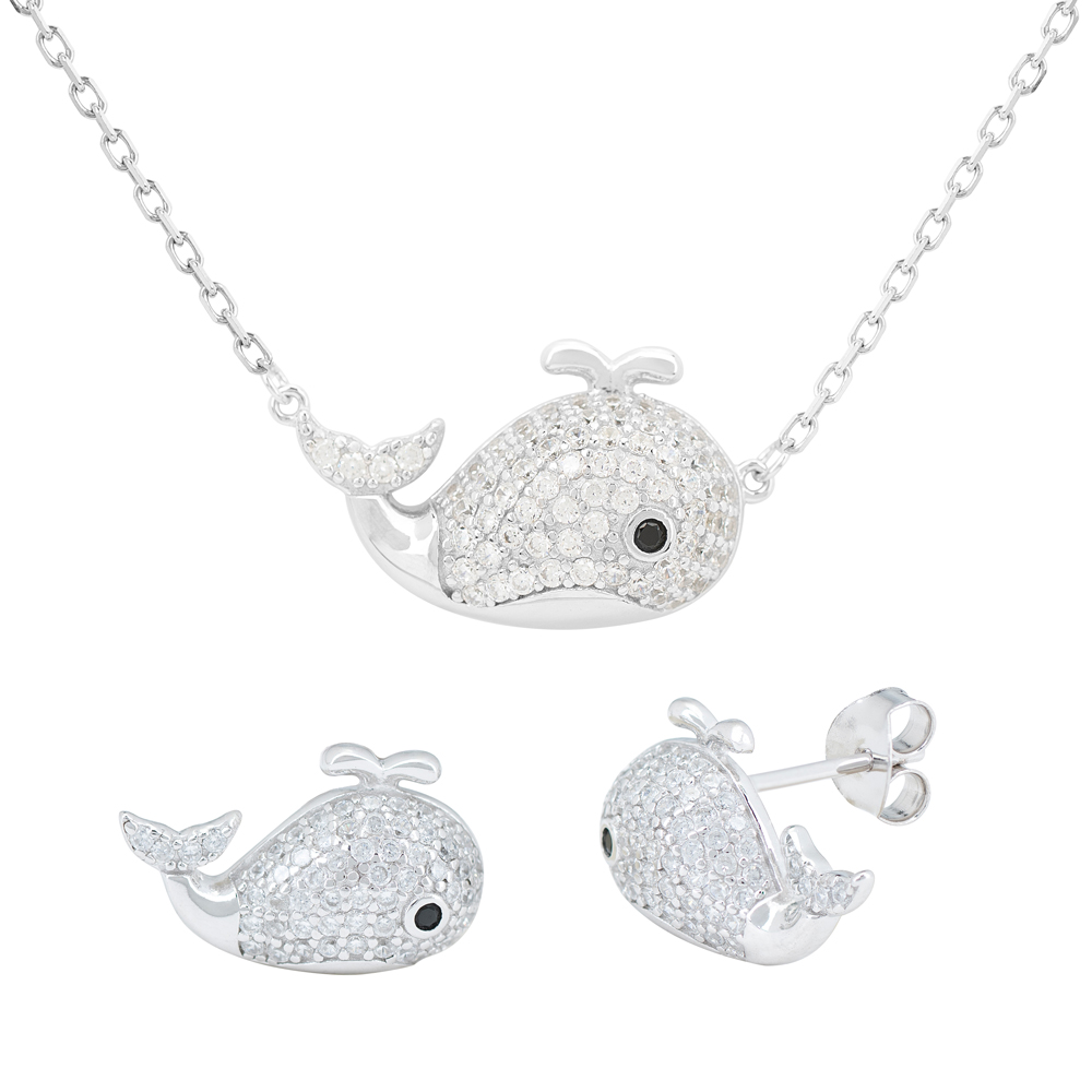 Silver Pave Whale with Clear CZ Necklace and Earring Set