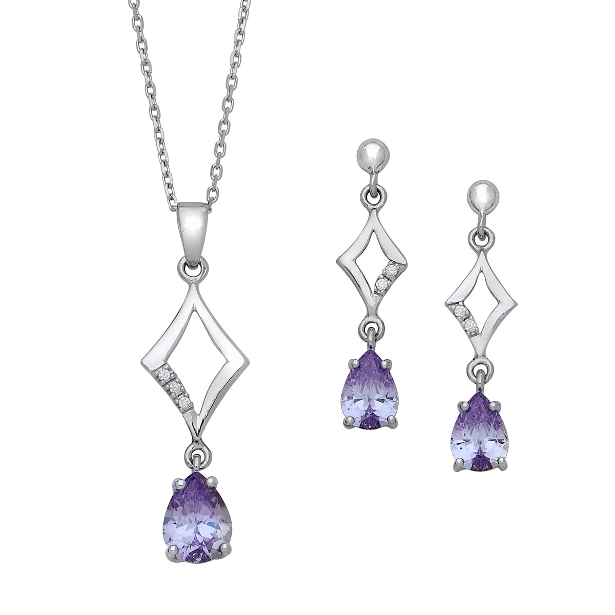 .925 Silver Rhombus Shape with White CZ's and a Pear Shape Lilac Color CZ Dangle Pendant and Earring Set
