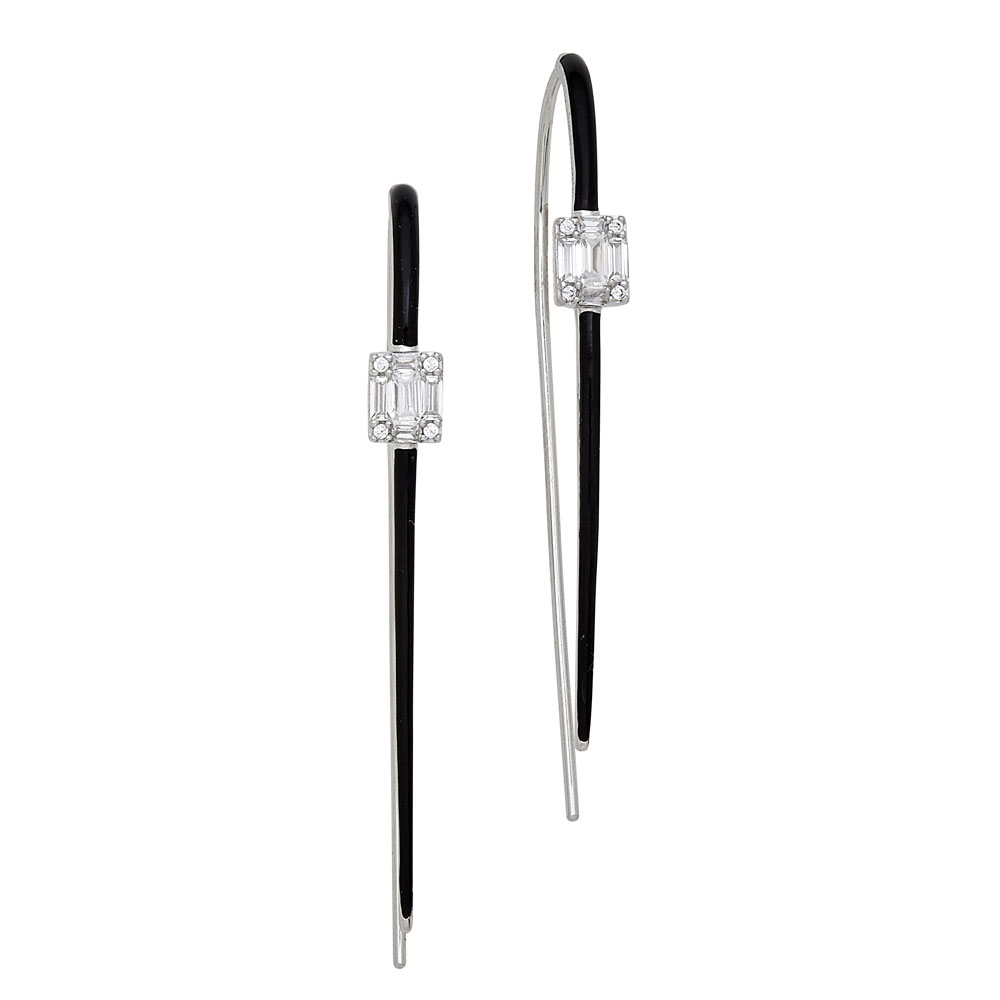 Silver Sleek Elegant Threader Earrings in Black Enamel Multi Baguettes with Corner Round CZs