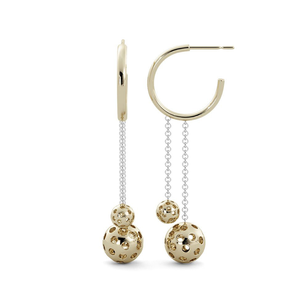 .925 Silver three-quarter hoop Pickleball post earrings with two balls on chain dangling two-tone rhodium and gold-plated