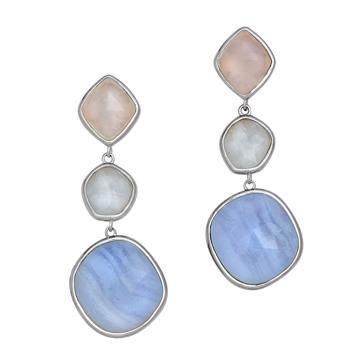 Silver Triple Genuine Stone Earrings with Blue Lace Agate, Moonstone and Rose Quartz