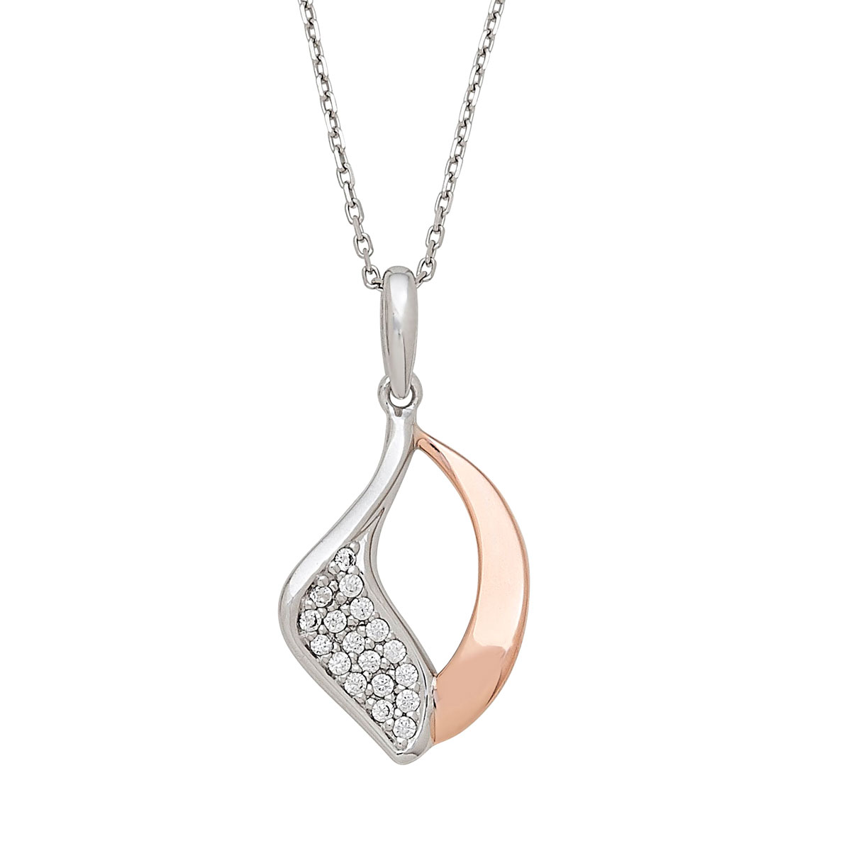 .925 Silver Two-tone Pendant Swirl Right-side Cluster of CZs Rhodium, Left-side Solid High-Polish Rosegold Finish Plating