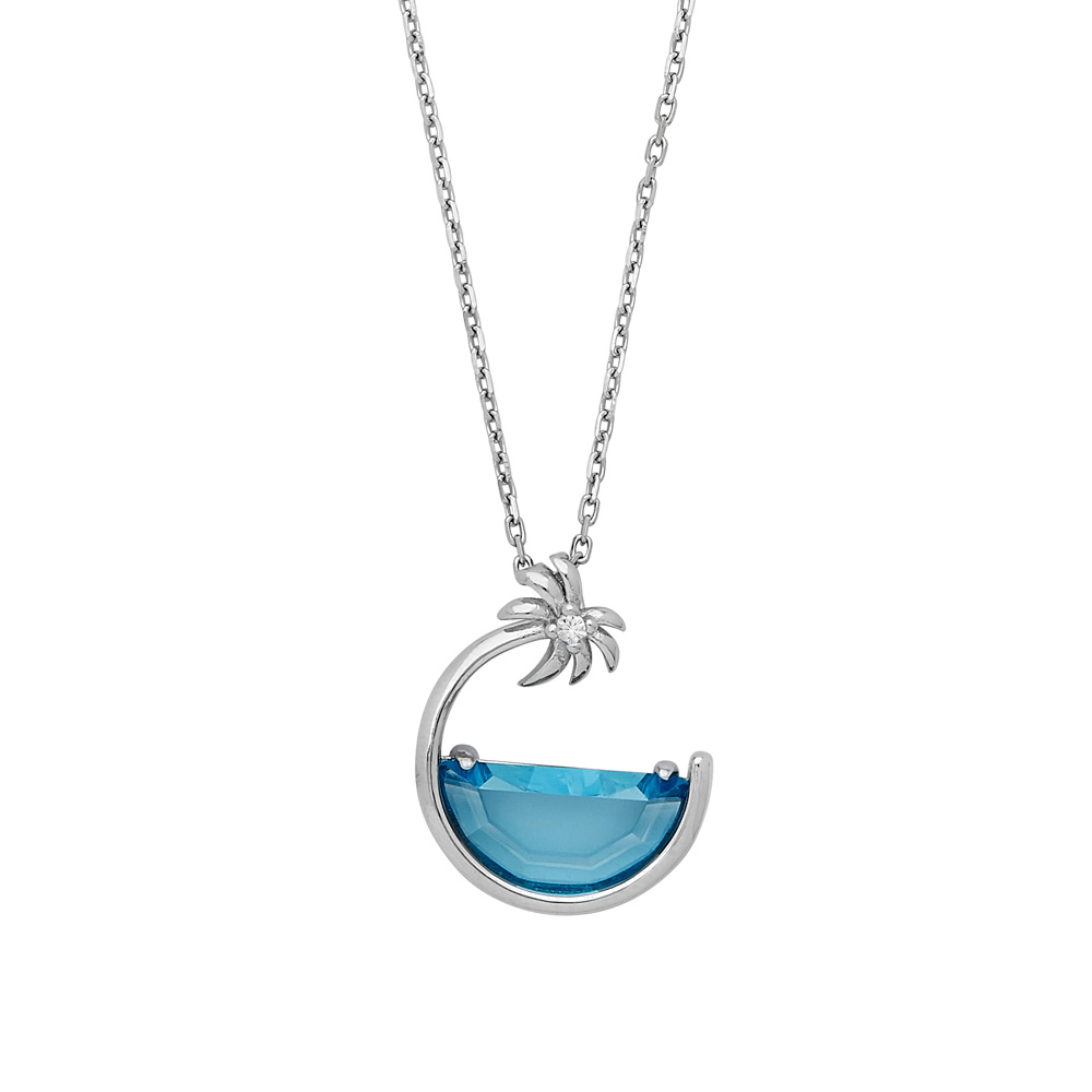 .925 sterling silver palm tree with single cz center pendant and the trunk holding a half round blue cz symbolizing body of water