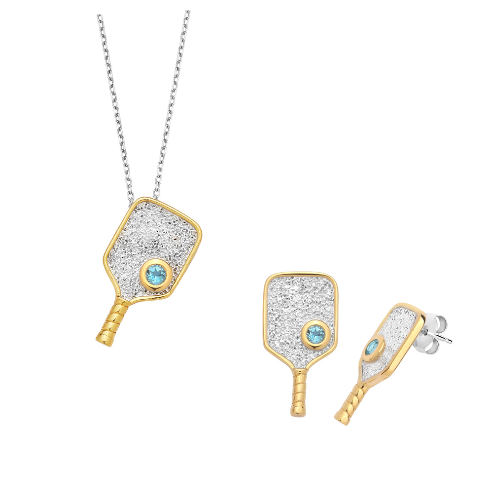 Silver Two-Tone Rhodium and Gold-Plating Textured Pickleball Paddle Earrings and Pendant Set with White Topaz